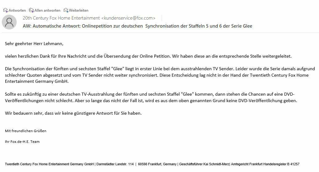 Der Petition wurde nicht entsprochen 12.02.2018, 15:16 Hallo zusammen, im Anhang die Mail von Fox. Laut deren Aussage liegt der Sync beim Sender. Ich bleibe aber am Ball. Gruss Andreas