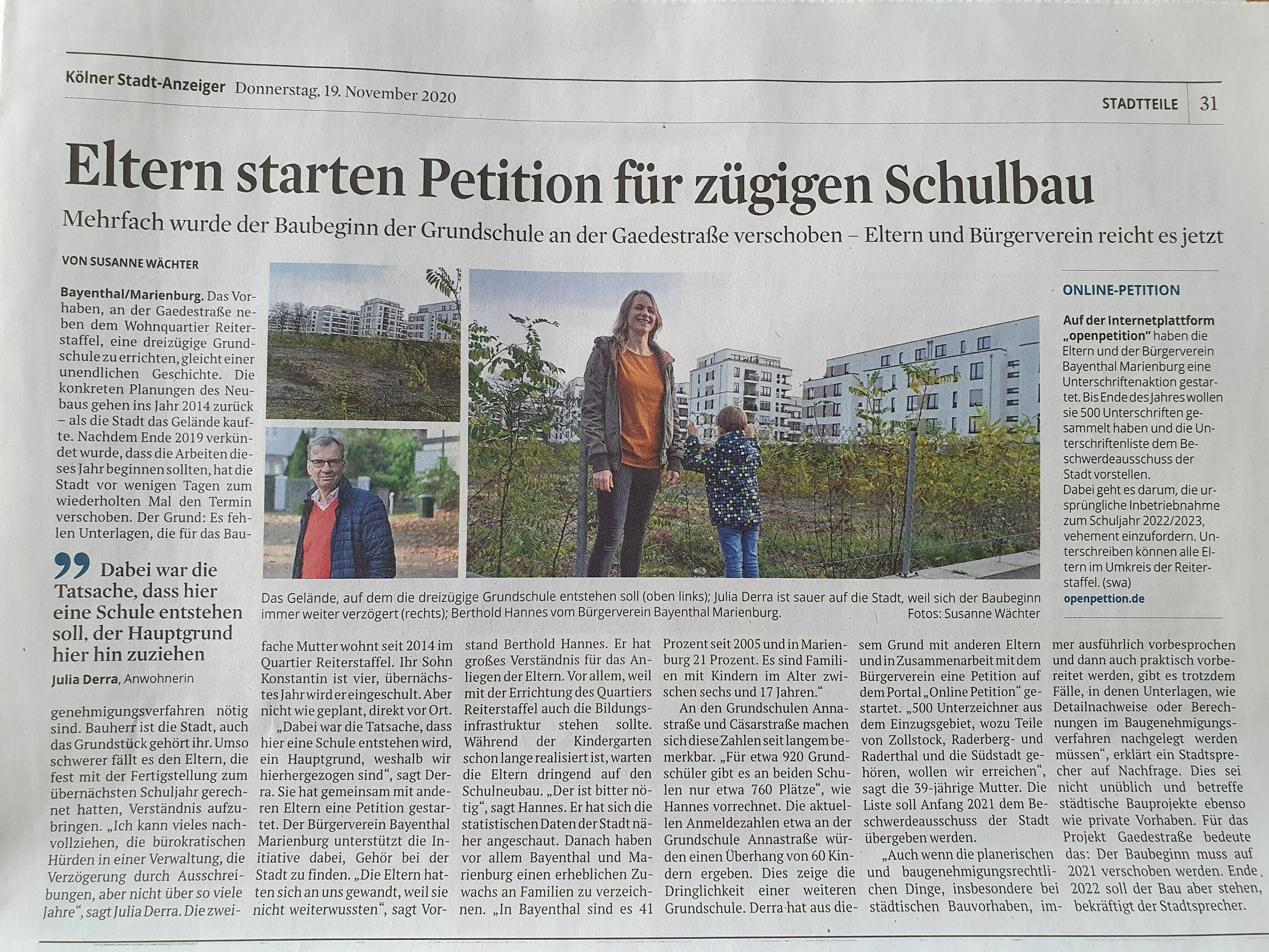 Anfang Januar haben wir bzgl des Schulbaus inkl. unserer alternativen und kompromissbereiten Vorschläge für Übergangslösungen ein Schreiben an den Ausschuss für Anregungen und Beschwerden der Stadt Köln gerichtet. Hierzu kam bisher die Rückmeldung, dass nun zu den zuständigen Mitarbeitenden Kontakt aufgenommen und die aktuelle Sachlage überprüft wird.