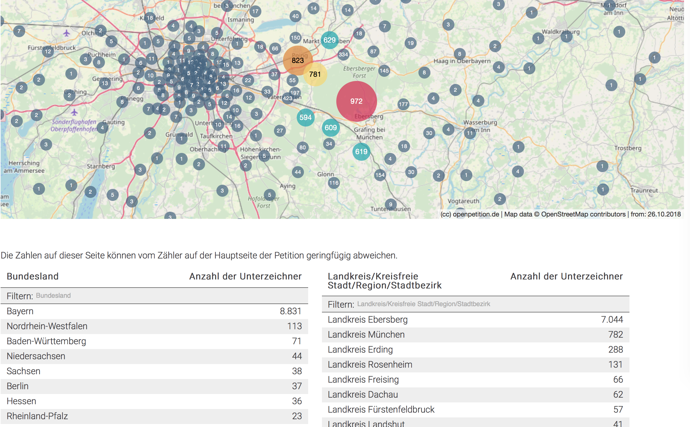 Die Presse und der BR berichteten ausführlich. www.merkur.de/lokales/ebersberg/ebersberger-land-ort28613/petition-fordert-haende-weg-vom-ebersberger-forst-11413086.html www.sueddeutsche.de/muenchen/ebersberg/petition-wird-im-kreistag-behandelt-unterschriften-gegen-umfahrung-und-windraeder-1.4298654 www.br.de/nachrichten/bayern/petition-fordert-haende-weg-vom-ebersberger-forst,RFrM0Lw