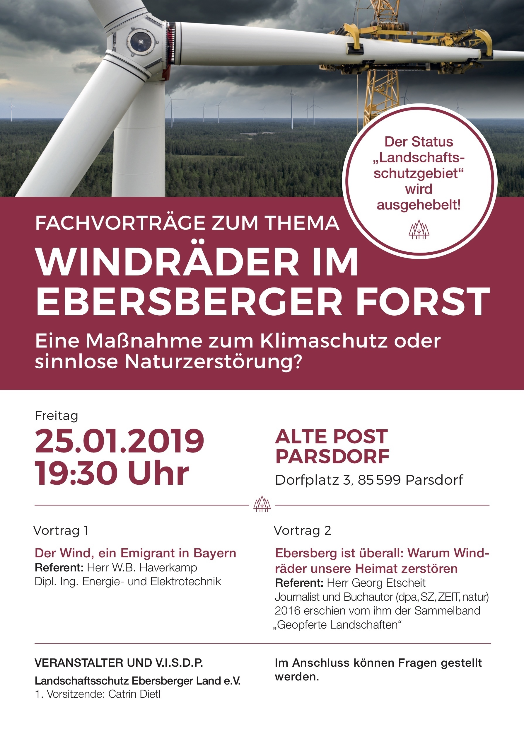 hier nochmals der Hinweis auf die Informationsveranstaltung des Landschaftsschutzverband Ebersberger Land e.V. am 25.01.19 in Parsdorf.