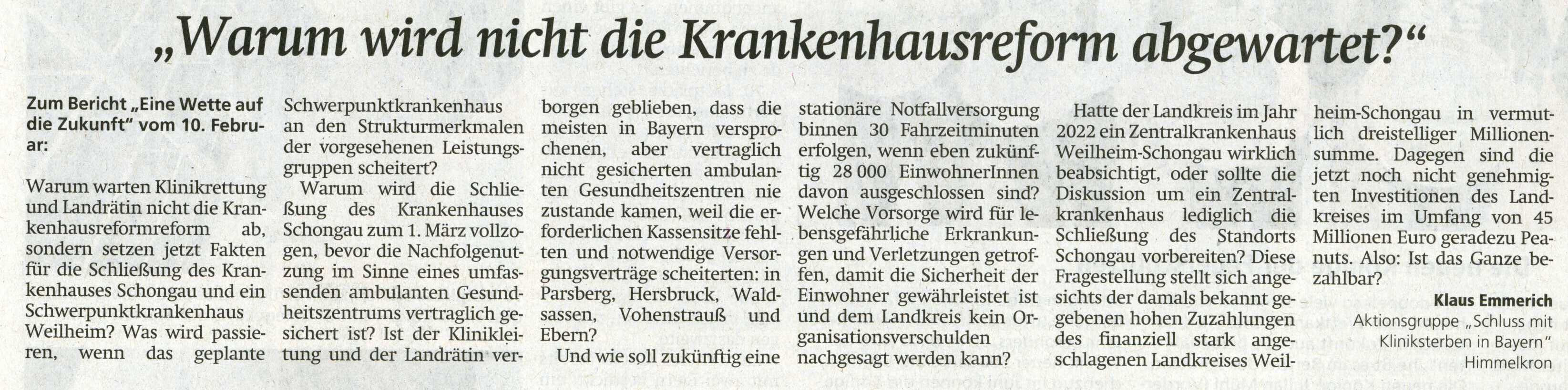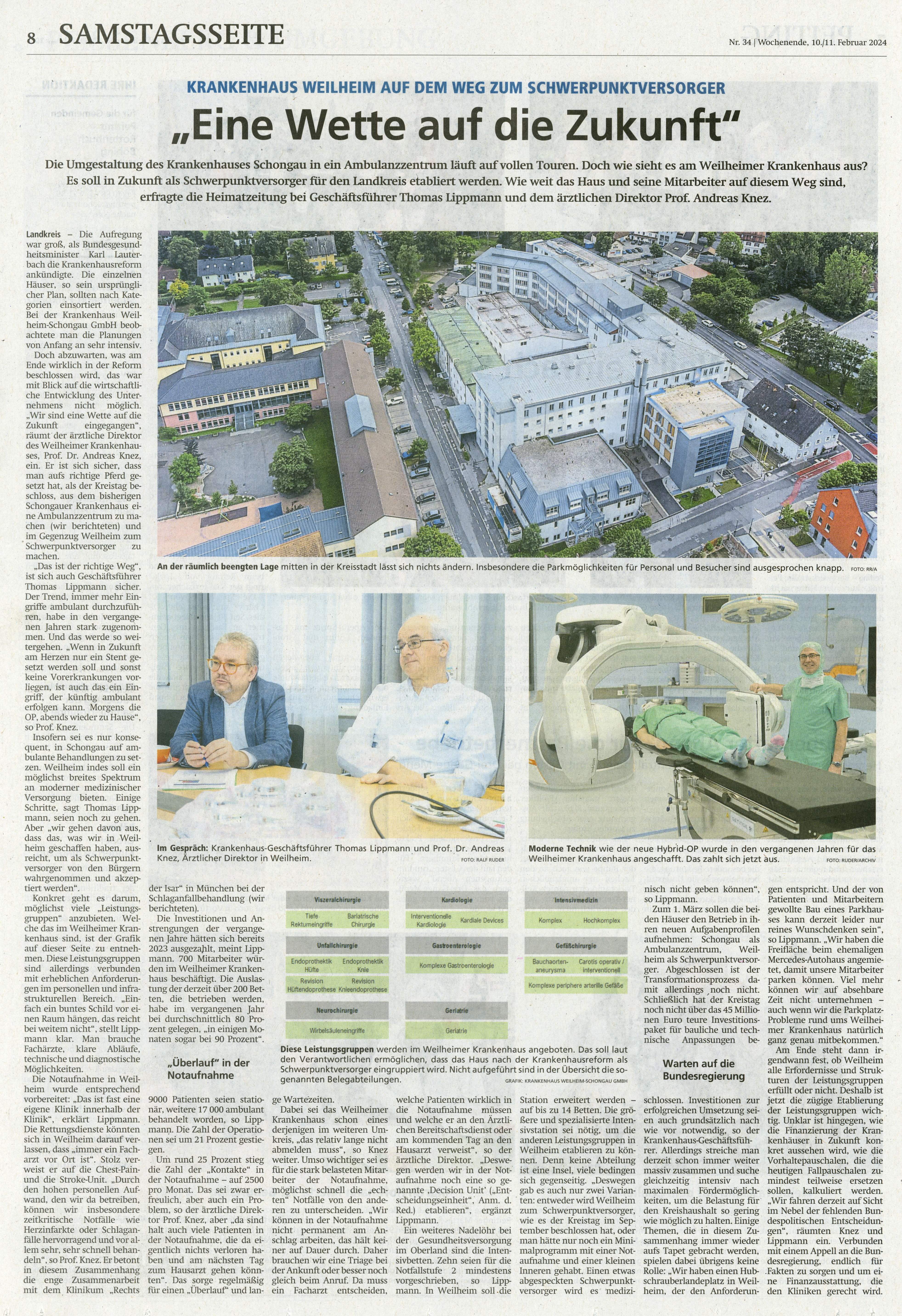 Hier erfahren Sie nämlich, wie sich der Geschäftsführer der Krankenhaus GmbH Weilheim-Schongau und der Ärztliche Direktor in Weilheim die Umgestaltung des Krankenhauses Weilheim als Schwerpunktversorger vorstellen. Beide sind sich sicher, dass "man aufs richtige Pferd gesetzt hat".