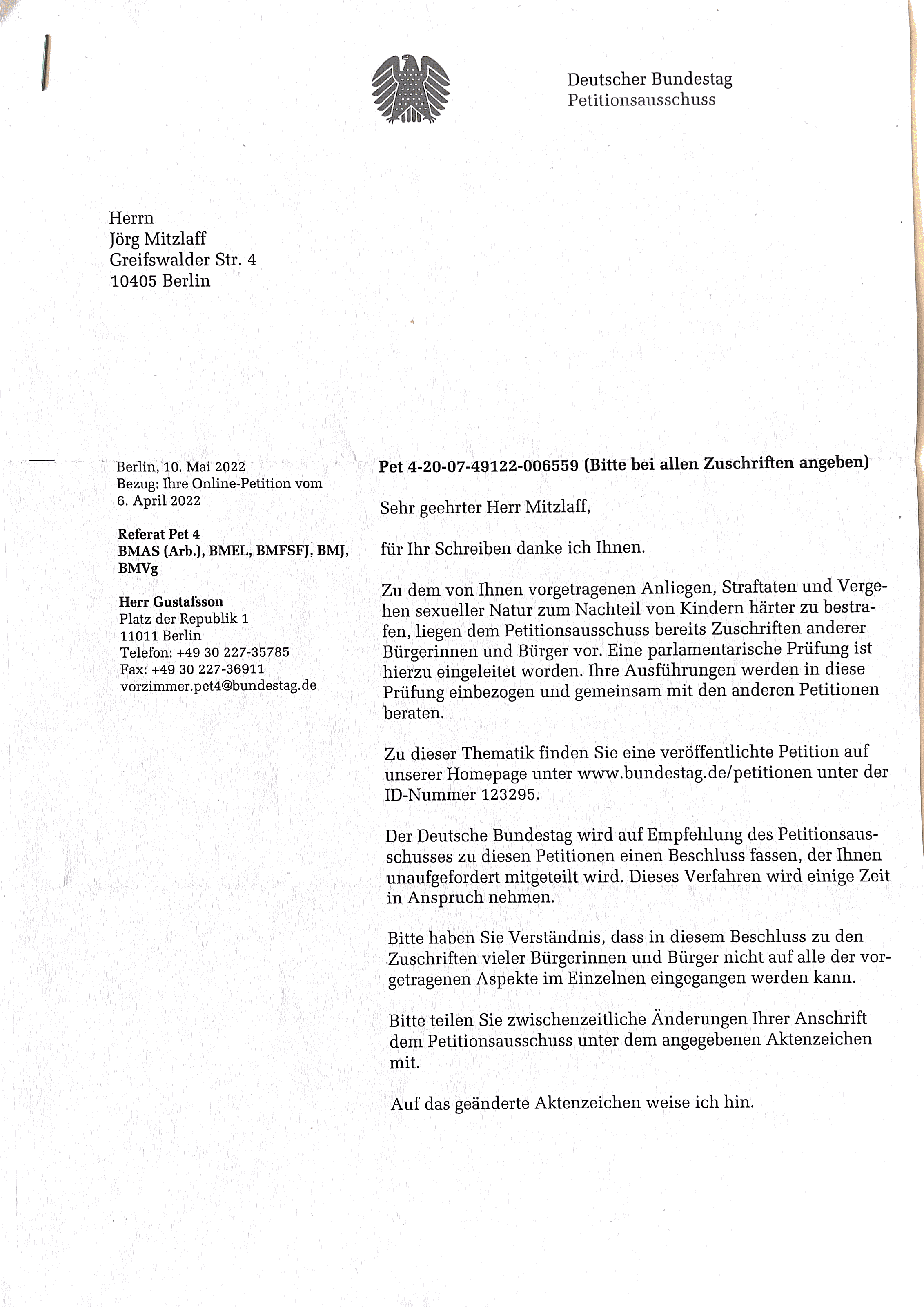 dem Petitionsausschuss liegt bereits eine (oder mehrere) Petition(en) zum gleichen Thema vor. Zur effektiveren Bearbeitung des Anliegens, wird das Petitionsverfahren abgeschlossen. Die Ausführungen der Petition fließen in die Beratung mit ein.