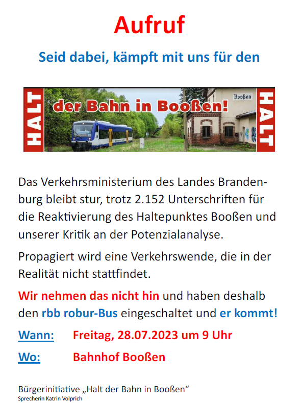 Der Landtag hat einen Entwurf zum Landesnahverkehrsplan vorgestellt. Der Haltepunkt Booßen ist darin nicht aufgeführt. Jeder kann nun Einwendungen bis zum 21.06.22 ans Landesministerium unter brandenburg-bewegen.de/ abgeben und den Haltepunkt darin fordern. Wir haben deshalb unsere Unterschriftensammlung bis auf dieses Datum verlegt.