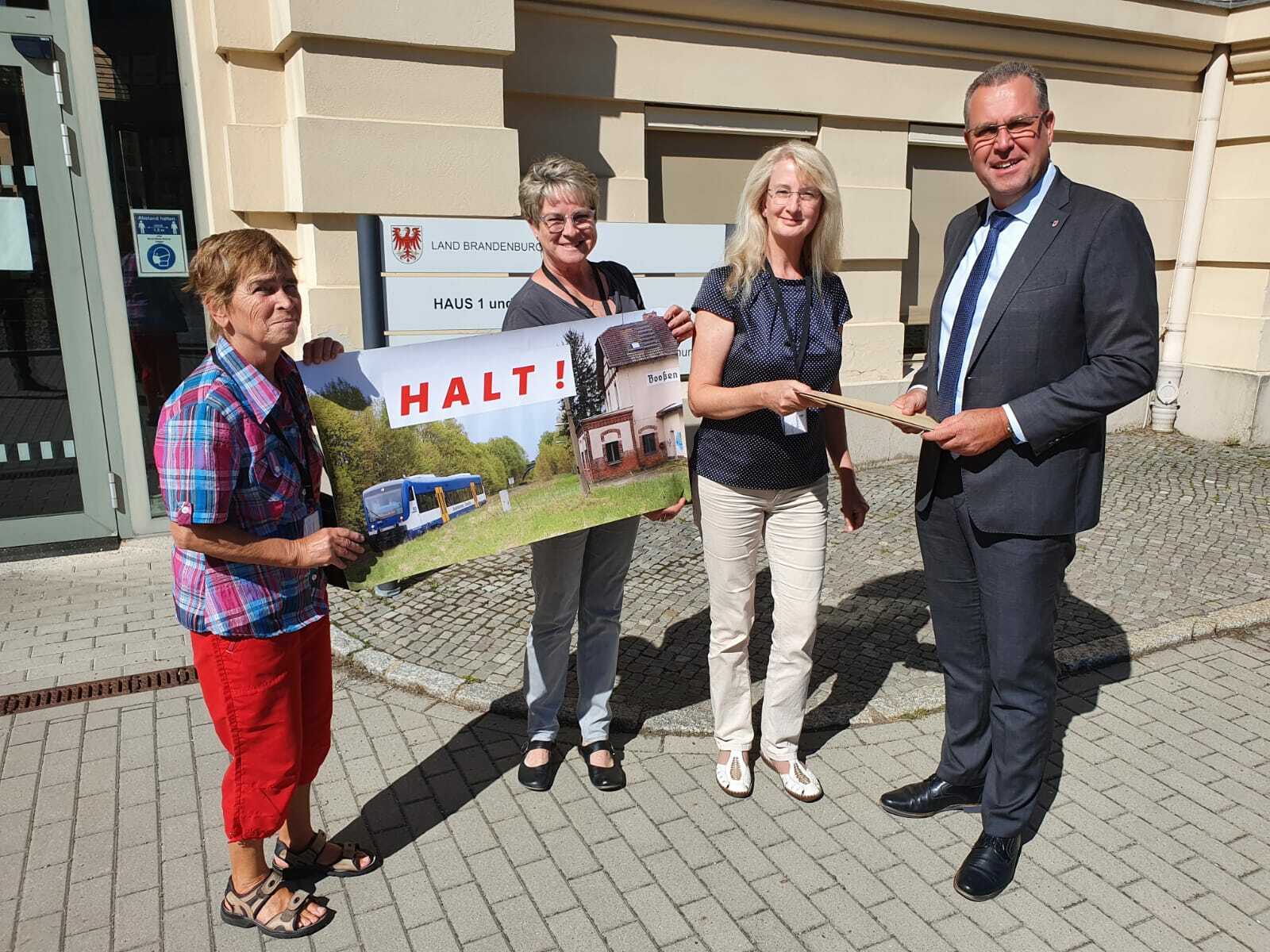 Liebe Unterstützer des Haltepunktes Booßen. Zunächst noch einmal vielen Dank an alle die unterschrieben und die Initiative unterstützt haben. Gemeinsam mit Euch haben wir das Unterschriftenziel von 2.000 sogar um 152 übertrumpft. Im Juli war es dann soweit. Wir haben die Unterschriftensammlung an das Ministerium übergeben. Der Staatssekretär Rainer Genilke nahm sich eine halbe Stunde Zeit unser Anliegen anzuhören. Er hat uns zugesichert, die Schwachstellen aus der Potenzialanalyse zur Einstufung des Haltepunktes Booßen nochmals anzuschauen. Wir werden nachhaken!