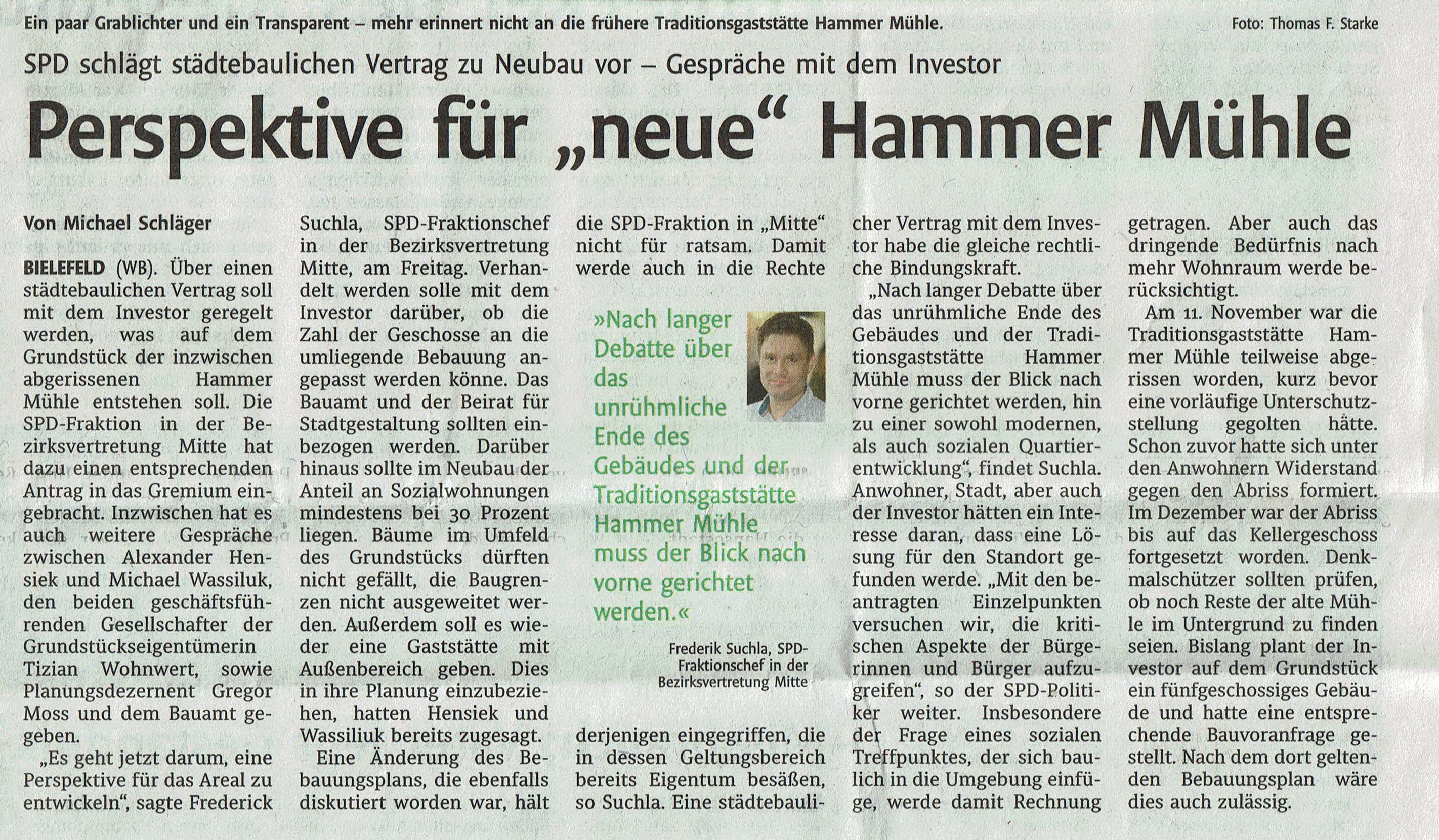 Am Samstag, 15.01.2022, hat das Westfalenblatt einen Vorschlag der SPD zur Hammer Mühle veröffentlicht (Bild anbei). Dieser Vorschlag zielt auf eine der Platzsituation angepasste Neubau-Lösung in Form eines Vertrags, berücksichtigt jedoch nicht die juristische Situation der derzeitigen Sachlage. Also nur ein Wunsch! Über eine Abstimmung mit den Grünen als Koalitionspartner kann Herr Suchla offensichtlich nichts sagen.