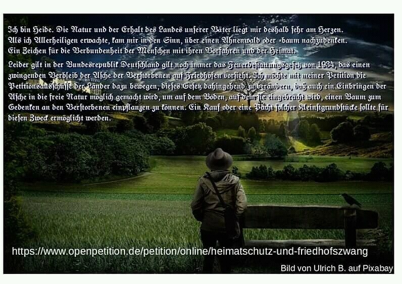 Liebe Unterſtützer meiner Petition. Damit unſer gemeinſames Anliegen zu einem Erfolg wird, war ich nicht untätig und habe verſucht, weiter Mitſtreiter zu gewinnen. Dabei mußte ich auch viel Kritik einſtecken, da das Wort 'Heimatſchutz' anſcheinend bei einigen Ängſte auslöſt und ein Ahnenbaum als Totenkult mißverſtanden wird.