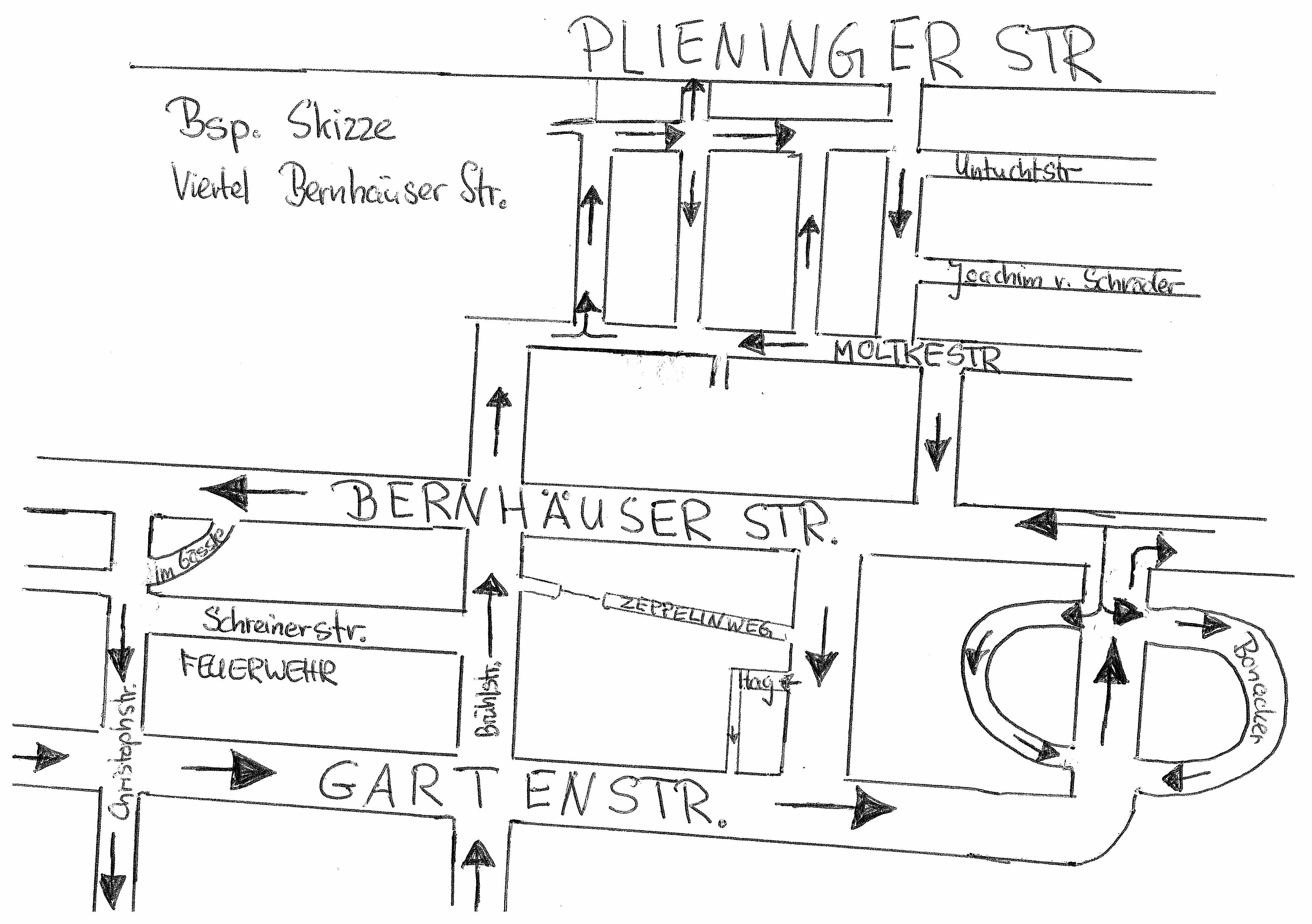 Anwendbar mit den o.g. Vorteilen in allen Vierteln deren Straßen schachbrettartig angeordnet sind: z.B. Bernhäuser-/Gartenstraße in Echterdingen von der Plieninger Straße bis zur Ausfahrt Stetten, Rathausviertel in Leinfelden zwischen Stuttgarter Straße und Bahnhofstraße, oberhalb der Kasparswald- / Forststraße in Stetten, Friedrich- / Hermannstraße in Musberg usw.