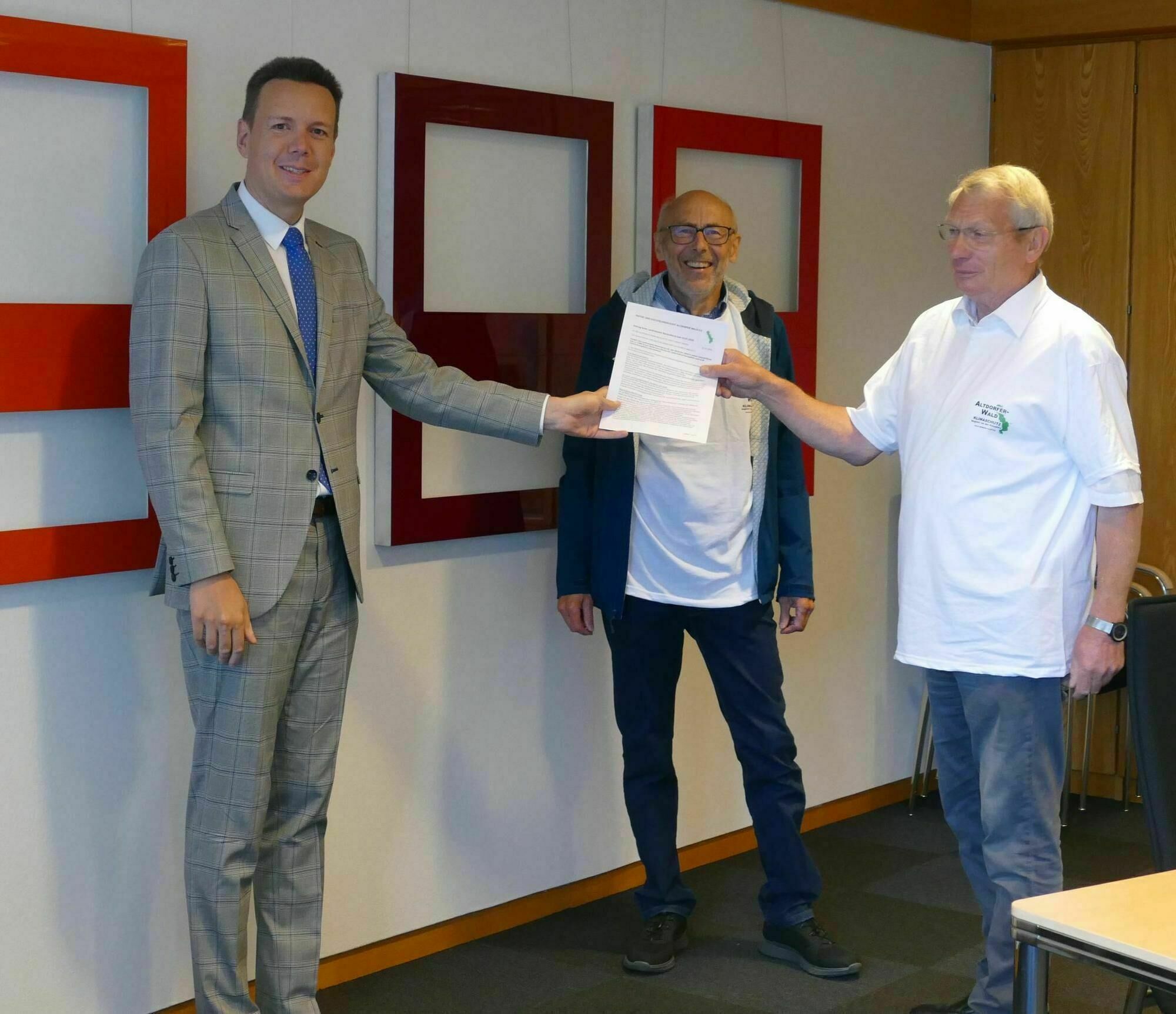 Am 2.7. haben wir die Petition samt Unterschriftenliste und dem Antrag auf Ausweisung eines Landschaftsschutzgebietes (mit Kiesausschluss!) dann dem Landkreis Ravensburg, in Vertretung Herrn Sievers übergeben (www.schwaebische.de/landkreis/landkreis-ravensburg/ravensburg_artikel,-altdorfer-wald-wird-thema-im-kreistag-_arid,11241542.html). Dabei haben wir unsere Standpunkte nochmals offengelegt. Wir haben allerdings dem Landratsamt nur eine Liste mit den Wohnorten der Unterzeichner ohne Namensnennung übergeben.