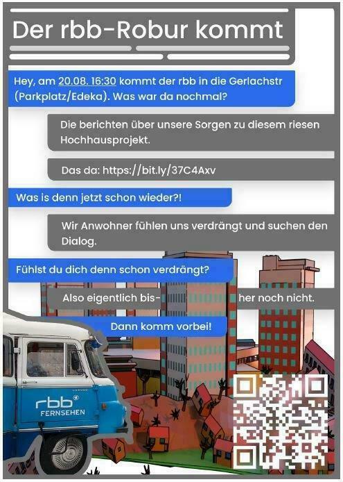 am 20.08.2021 um 16:30 Uhr kommt der rbb in die Gerlachstraße )Parkplatz/Edeka).