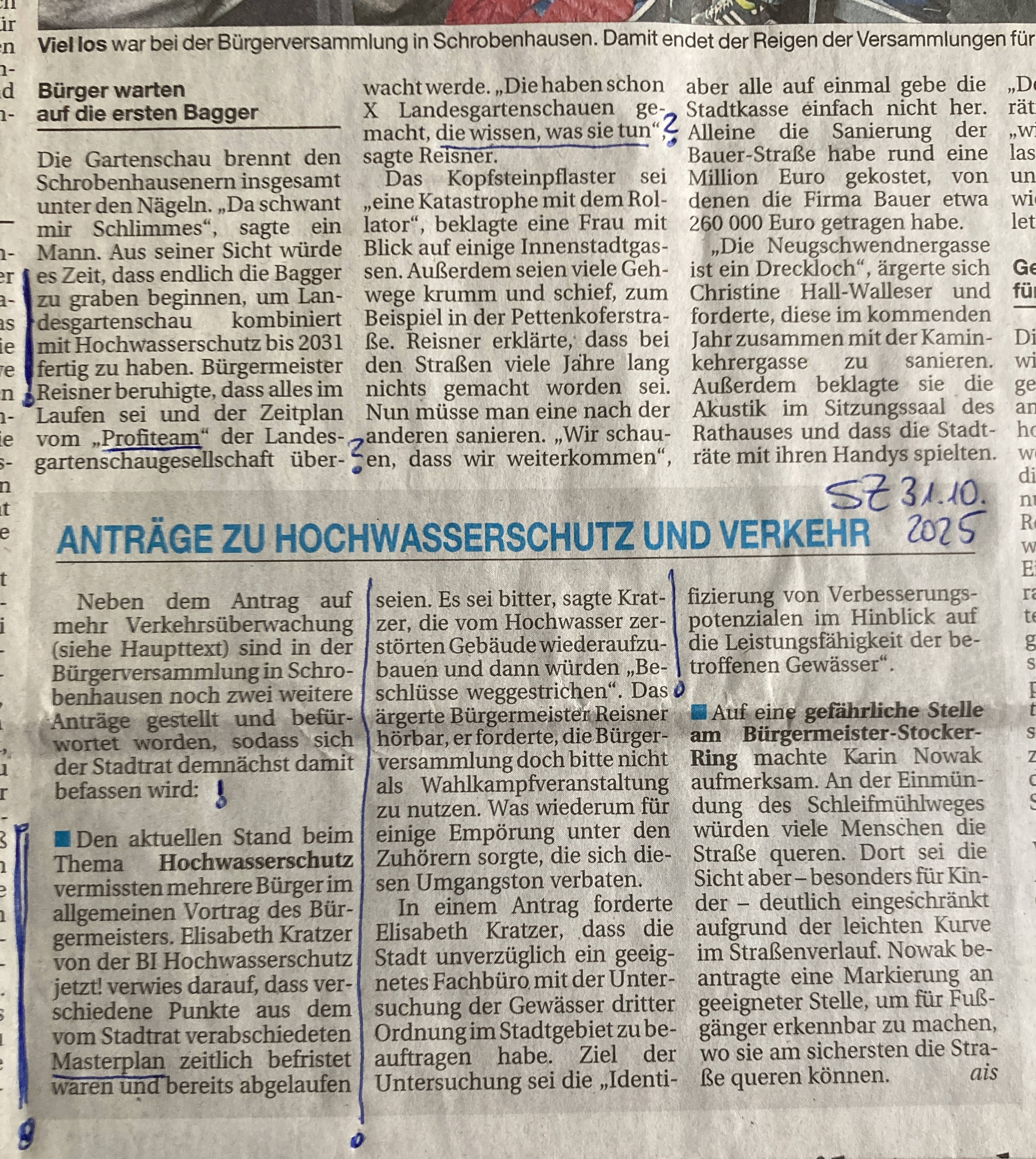 Elisabeth Kratzer von der BI, erste Vorsitzende des neugegründeten Vereins Hochwasserschutz Schrobenhausen e.V. wird mehrfach vom wütenden und sichtlich aufgebrachten Bürgermeister unterbrochen, er versucht vergeblich (!), sie an ihren Erläuterungen zu dem folgenden Antrag zu hindern. Die meisten Zuhörer sind empört und reagieren mit lautem Beifall für ihre Standhaftigkeit.