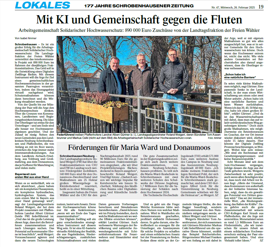 Wenn es nicht anders geht, dann muss wohl manchmal mit gehörigem Druck nachgeholfen werden. Dass die Bürgerinitiative Hochwasserschutz jetzt-Wir haltn zsam diesen Schritt gegangen ist, zeigt doch nur, wie sehr die Betroffenen sich eine Aufarbeitung der Katastrophe vom Juni 2024 wünschen. Es kann doch nicht sein, dass am Samstag Mittag verkündet wird, dass man alles im Griff habe (Zitat Landrat von der Grün) und abends die Katastrophe über die Stadt hereinbricht.