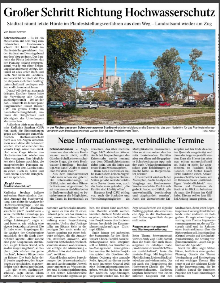 Endlich ist ein kleiner Schritt geschafft auf dem Weg zum Hochwasserschutz. Durch einen vor Jahren gemachten Fehler in der Bauleitplanung der erst jetzt entdeckt wurde, musste nun monatelang verhandelt und umgeplant werden, diverse Einsprüche abgearbeitet oder zurückgewiesen werden, seitenlange Begründungen formuliert werden, nun ist es endlich erfolgreich unter Dach und Fach.