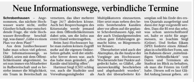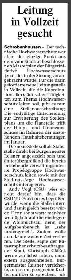 Nun kommt es darauf an, eine geeignete Fachkraft zu finden, die dann schnellstens in der Lage sein sollte, die Hochwasserschutzmaßnahmen zu koordinieren, die Stadträte zu beraten, die Bevölkerung zu informieren und dem Bürgermeister zur Seite zu stehen wenn es wieder einmal soweit ist, dass die Bäche und Flüsse überlaufen. Niemand wünscht es sich, und doch wird es in jeder Sitzung mindestens einmal ausgesprochen: