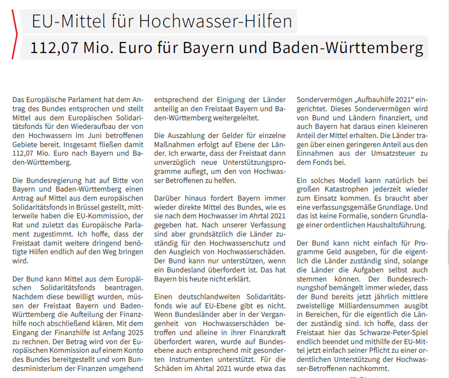Nein, so einfach geht es eben leider nicht. Der Freistaat Bayern müsste zunächst seine finanzielle Überforderung bei der Bewältigung der Hochwasserschäden vom Juni festellen und im Bund um Unterstützung bitten. Da dies bislang nicht geschehen ist, könnte ein Betroffener sich auch leicht denken, dass es im bayrischen Haushalt keine größeren Lücken gibt, sprich, genug finanzielles Polster vorhanden ist!