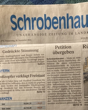 Die Schrobenhausener Zeitung und ein kleines Team vom Lokalsender IN-TV waren live dabei als 8 Vertreterinnen und Vertreter der Bürgerinitiative die bis heute gesammelten 4023 symbolisch verpackt in einem Weihnachtskarton überbrachten.