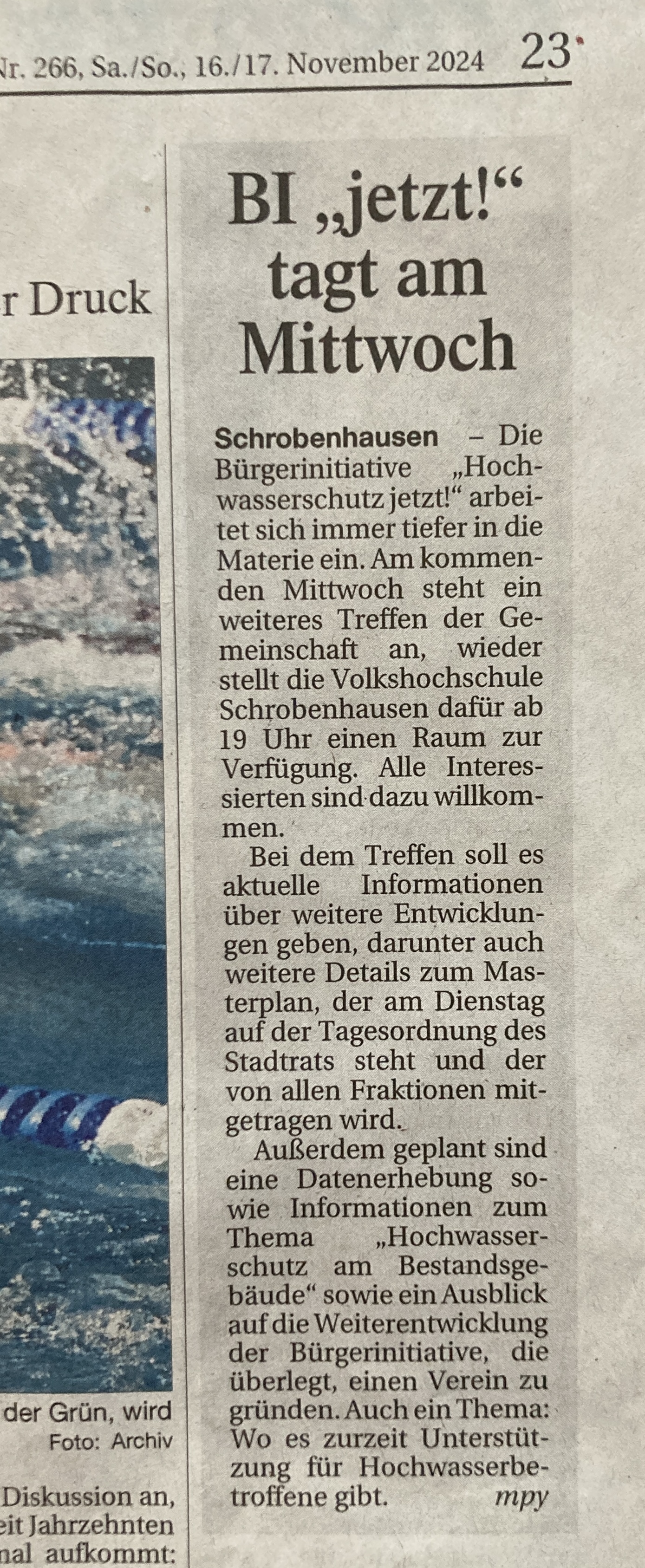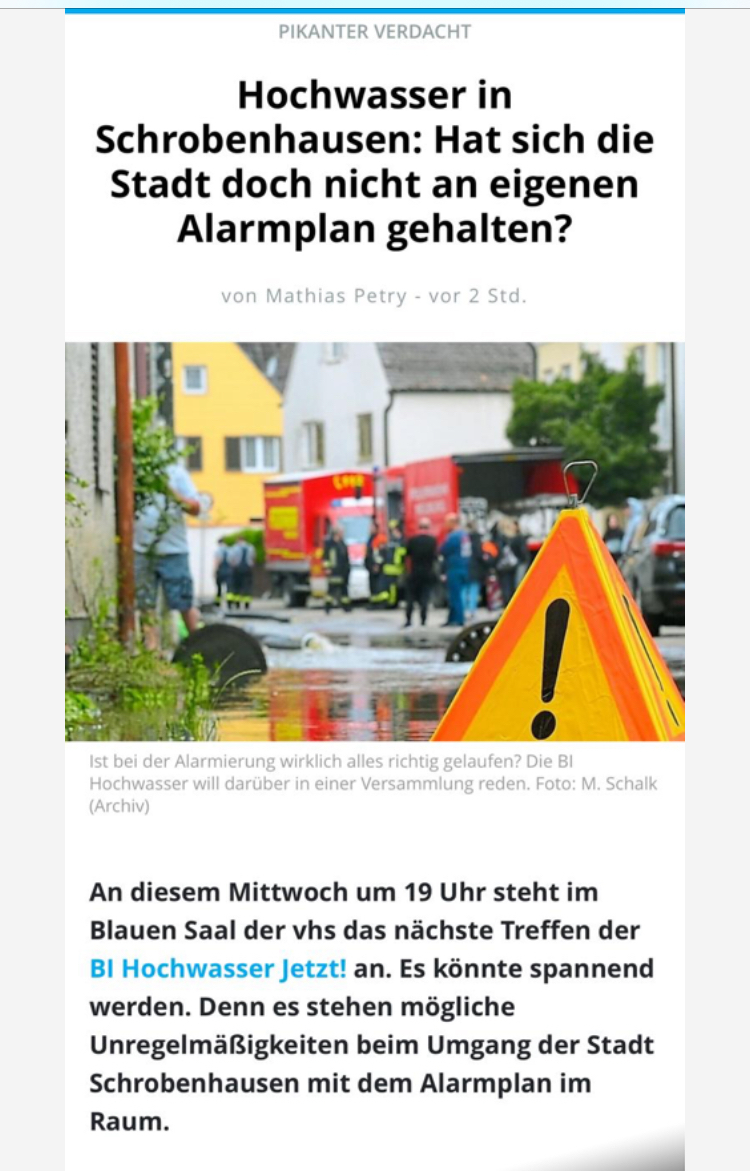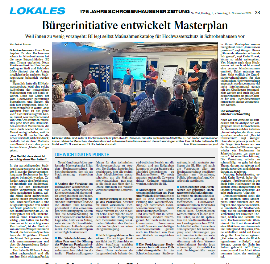 Die Bürgerinitiative leistet viel Hintergrundarbeit. Am 19.11. 245 wird über einen sogenannten Masterplan im Stadtrat abgestimmt. Soweit bekannt, wird wohl einstimmig dem Vorschlag der BI zugestimmt werden. Das freut uns einerseits, andererseits kann es nicht so weitergehen, denn die Mitglieder der BI sind allesamt berufstätig, viele stecken mitten in Wiederaufbauarbeiten und engagieren sich neben ihren persönlichen enormen Herausforderungen ehrenamtlich!