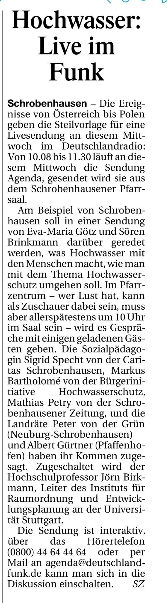 Mittwoch, 18.9.2024 wird die Sendung "Agenda" des Deutschlandfunks in Schrobenhausen live gedreht, Bürger und Bürgerinnen, Betroffene und Interessierte haben die Möglichkeit, mitzudiskutieren.