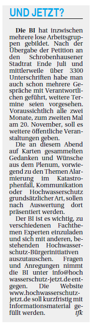 Am 20.November gibt es eine weitere öffentliche Veranstaltung der BI, hier werden dann die Ergebnisse der kleinen spontanen Umfrage präsentiert.