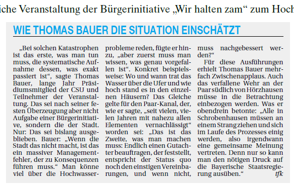 Auf den Wissensaustausch kommt es an sagt auch eine sehr bekannte Schrobenhausener Persönlichkeit und kritisiert ganz offen den amtierenden Bürgermeister, der es bisher scheinbar immer noch nicht geschafft hat, zumindest einen IST-Zustand nach der Katastrophe zu dokumentieren.
