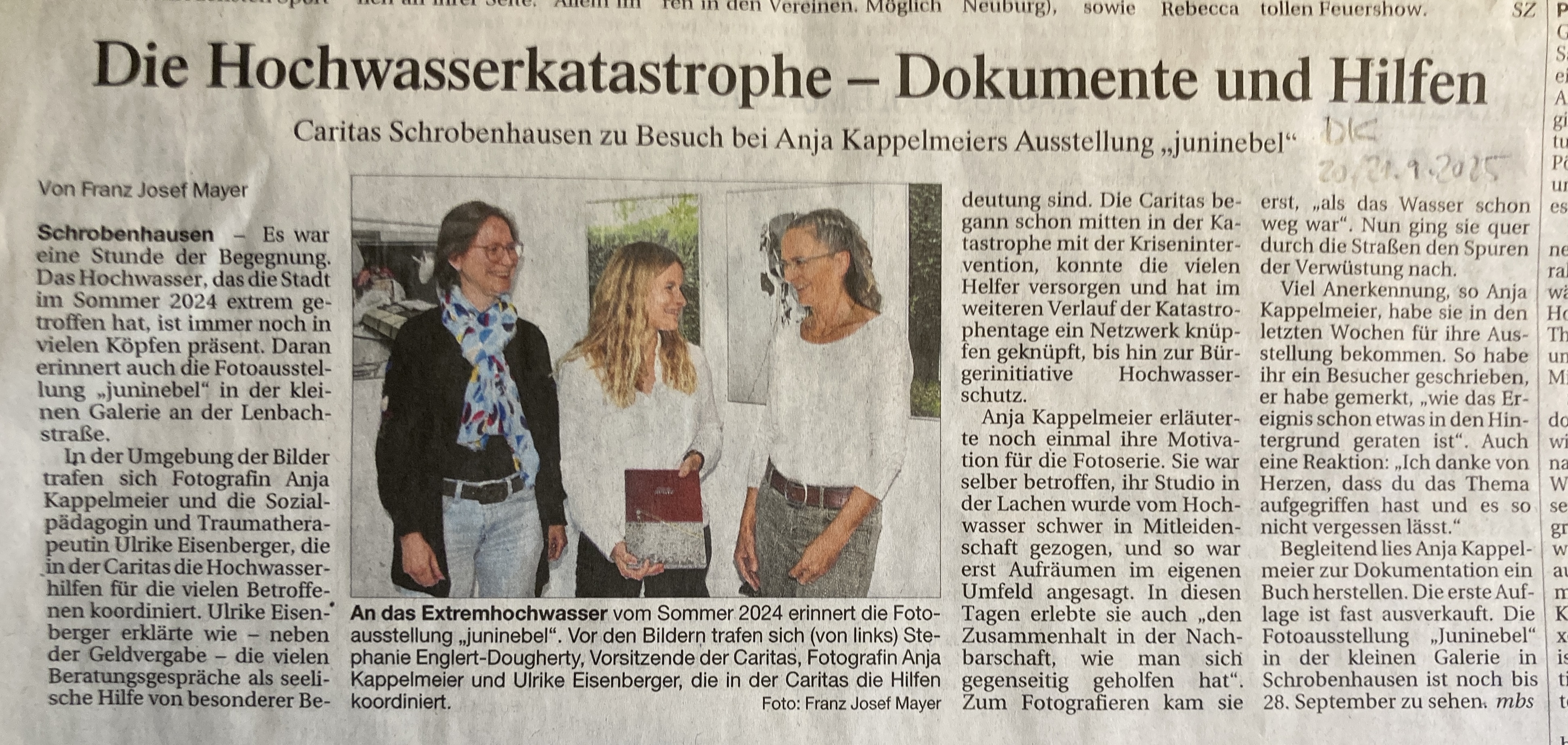 An das Extremhochwasser Juni 2024 in Schrobenhausen erinnern die Bilder von Anja Kappelmeier auf leise und unscheinbare Art. Manches wird erst auf den zweiten Blick klarer. Das gleichzeitig mit der Ausstellung erschienene Buch "Juninebel" ist bald vergriffen, eine zweite Auflage ist geplant!