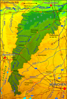 Das Einzugsgebiet ist 1632 km2 groß (hier grün dargestellt) und umfasst auch das Donaumoos (schraffiert).