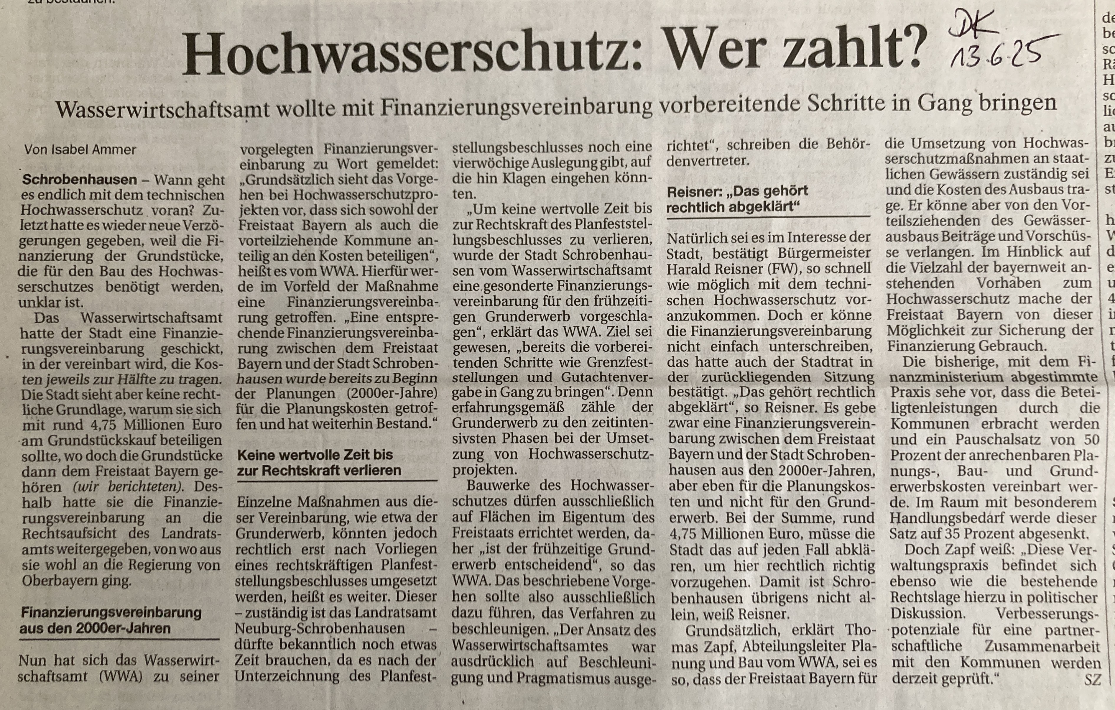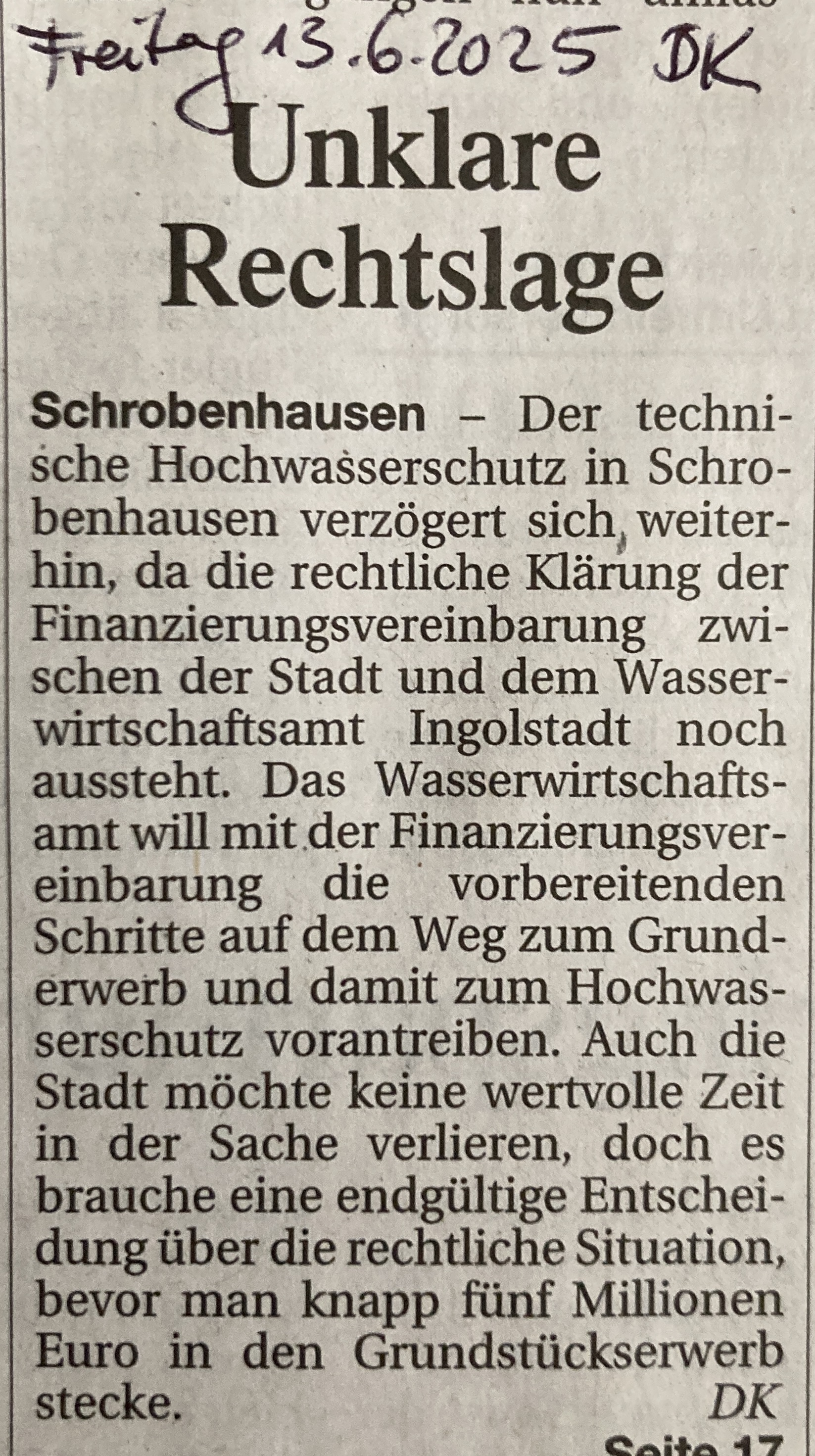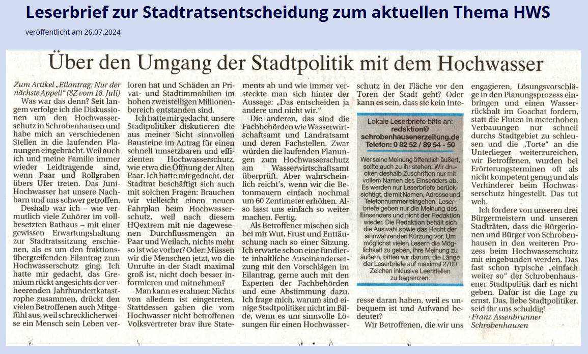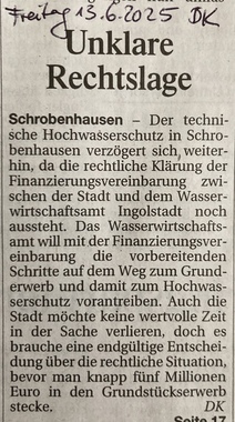 Die Bürger und Bürgerinnen von Schrobenhausen haben einen Anspruch auf klare Antworten, schließlich sind sie es doch, die schon seit Jahrzehnten für den Hochwasser-Schutz, nein, pardon, für die Schäden die Zeche bezahlen. Viele zig-tausende Steuergeld-Euro sind schon seit ewigen Zeiten immer wieder für Planungen, für Gutachten, Gegengutachten, für neue Planungen, für Überarbeitung von alten Plänen, für neue Gutachten und für was noch alles ausgegeben worden.