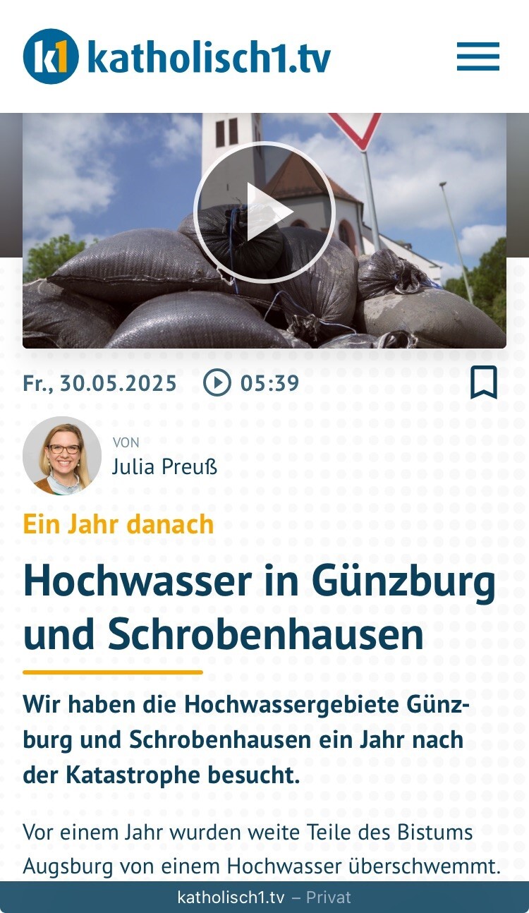 Vor einem Jahr wurden weite Teile des Bistums Augsburg von einem Hochwasser überschwemmt. Innerhalb weniger Stunden stieg der Wasserpegel auf Jahrhundertniveau. Besonders schwer traf es Schrobenhausen. Die komplette Innenstadt war durch das Wasser überflutet.