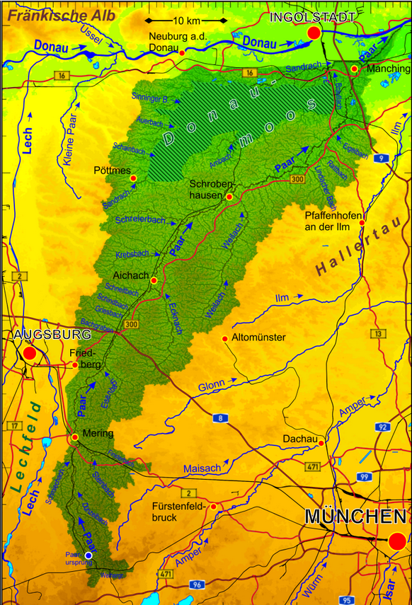 Aussergewöhnlich ist auch der Verlauf der Sandrach: von Pöttmes kommend verläuft dieser kleine Nebenfluss durch das riesige Niedermoorgebiet Donaumoos bis er bei Manching in die Paar mündet.