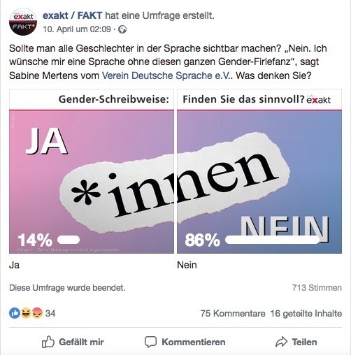 Trotz dieser tendenziösen Redaktionsarbeit zeigte das Ergebnis der späteren Facebook-Umfrage zur Sendung, wie groß die Abneigung gegen Gendersprache in der Bevölkerung ist: 86% der 713 Teilnehmer sprachen sich gegen die Gendersternchenschreibweise aus. Das Ergebnis bestätigt die vom VDS e.V. (Verein deutsche Sprache) beauftragte Insastudie mit 1000 Teilnehmern. Dort sprachen sich rund 75 Prozent der befragten Personen gegen gesetzliche Vorschriften zur Sprachneutralisierung aus.
