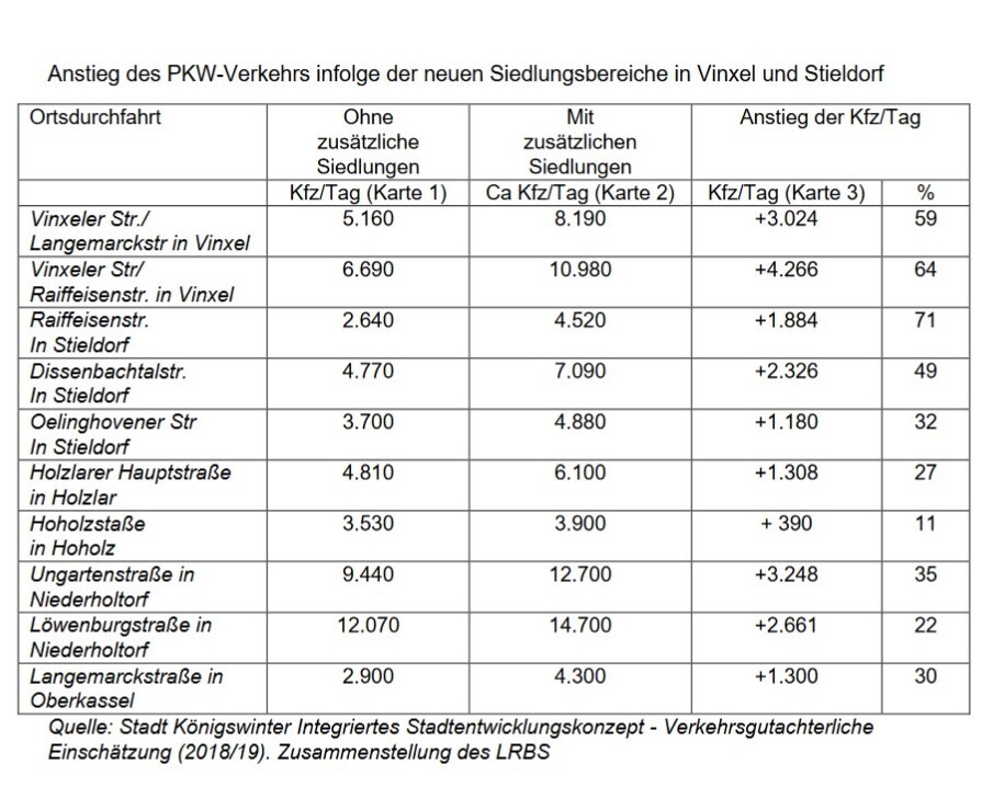 In den beiden Königswinterer Orten würde der Verkehr bis zu 70 Prozent ansteigen, und an den Beueler Ortsdurchfahrten in Holtorf, Gielgen, Roleber, Holzlar, Oberkassel um bis zu etwa einem Drittel (siehe Übersicht im Anhang).