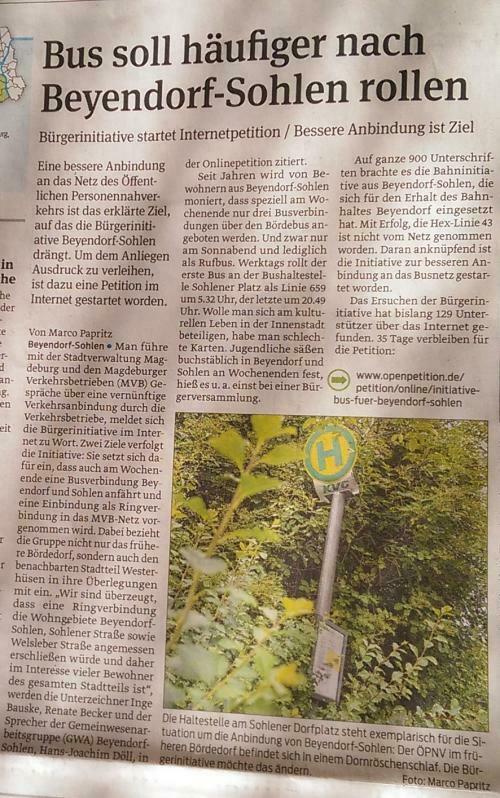 am 7.November wurde in der Magdeburger Volksstimme informiert, dass der Bauausschuss des Magdeburger Stadtrates für eine Verbindung von Westerhüsen entlang der Sohlener Straße über Sohlen und Beyendorf bis hin zum Bördepark gestimmt hat. Weiterhin ist Die Magdeburger Verkehrsbetriebe wurden beauftragt, ein entsprechendes Konzept zu erarbeiten. Dies wird im Zusammenhang mit den Planungen zum neuen Straßenbahnnetz erfolgen. Mit der Einrichtung der Busverbindung wird nicht vor dem Jahr 2020 gerechnet.