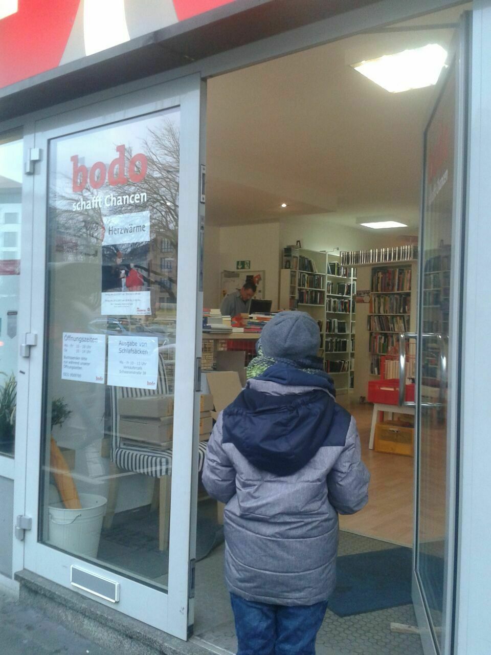 Das Bild zeigt Jonas im Eingang von der Druckerei des Strassenmagazins Bodo (schafft Chancen). In dem dazugehörigen Buchladen hat er einen Ausdruck der Petition abgegeben. Diese wurde mit den Worten: "Wir wissen schon, worum es geht," sofort ausgelegt.