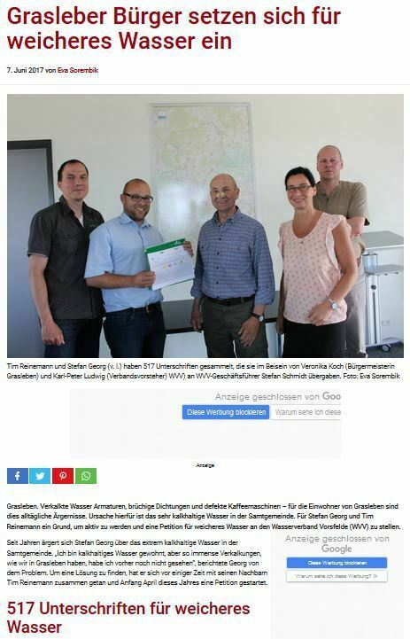 Verkalkte Wasser Armaturen, brüchige Dichtungen und defekte Kaffeemaschinen – für die Einwohner von Grasleben sind dies alltägliche Ärgernisse. Ursache hierfür ist das sehr kalkhaltige Wasser in der Samtgemeinde. Für Stefan Georg und Tim Reinemann ein Grund, um aktiv zu werden und eine Petition für weicheres Wasser an den Wasserverband Vorsfelde (WVV) zu stellen.