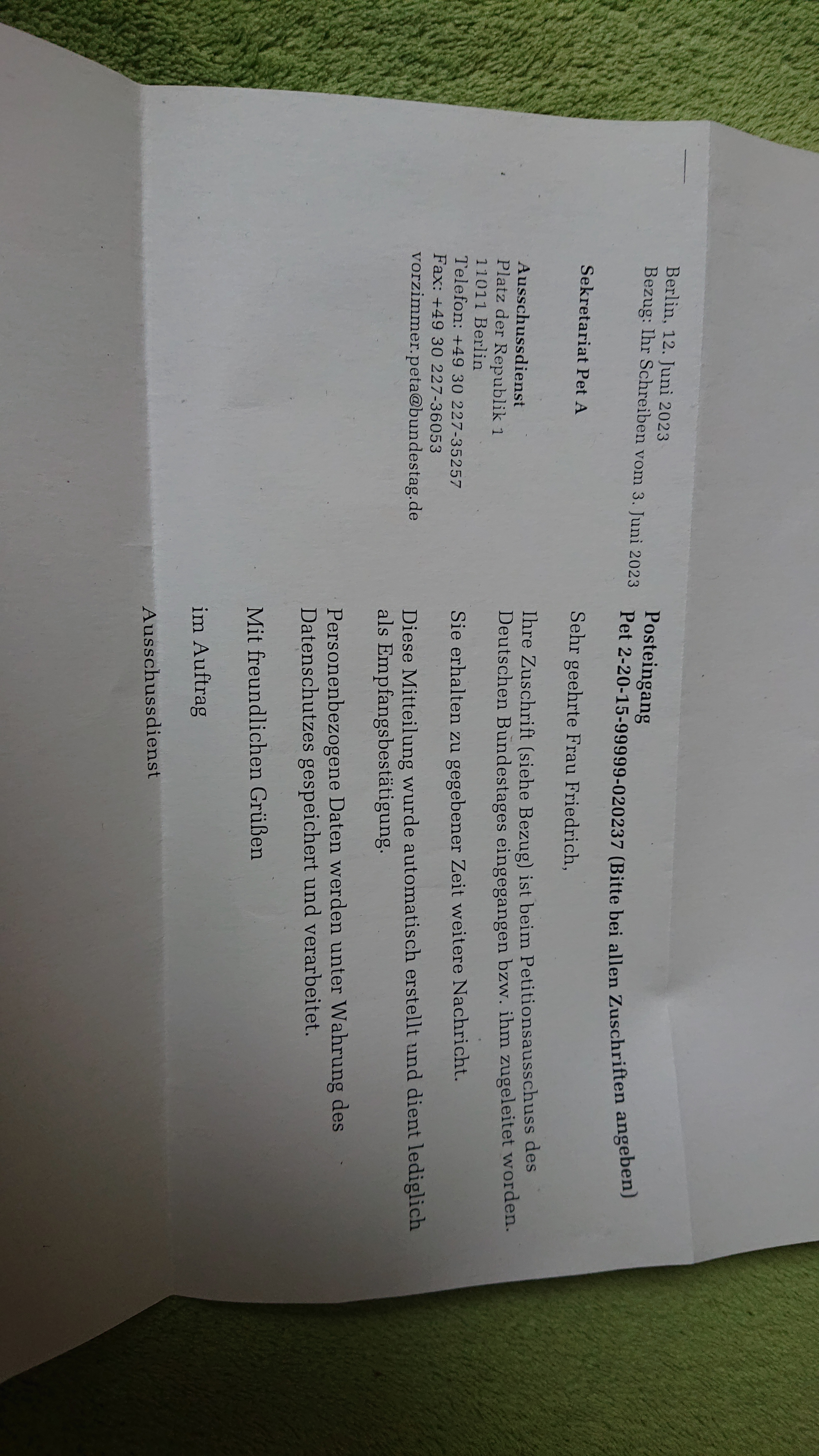 Petition wurde an den Petitionsausschuss übergeben. Zudem habe ich Frau Liebert vom Petitionsausschuss dazu persönlich angeschrieben. Nachfolgend ein genaueres Update als Kopie der Email :
