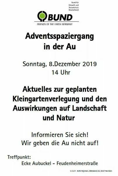 Der BUND möchte angesichts der aktuellen Ereignisse in der Feudenheimer Au im Zusammenhang mit der Verlegung von Kleingärten und dem geplanten Bau eines Radschnellwegs die Öffentlichkeit über Vorgänge, Hintergründe und seine Position informieren. Dazu lädt der BUND am zweiten Advent, also am Sonntag 8.12.2019 um 14 Uhr zu einem Ortstermin in Form eines Spaziergangs durch die betroffenen Teile der Au ein. Über Eure/Ihre Teilnahme an dieser Veranstaltung würden wir uns freuen; Näheres entnehmt/entnehmen Sie bitte dem anhängenden Flyer.