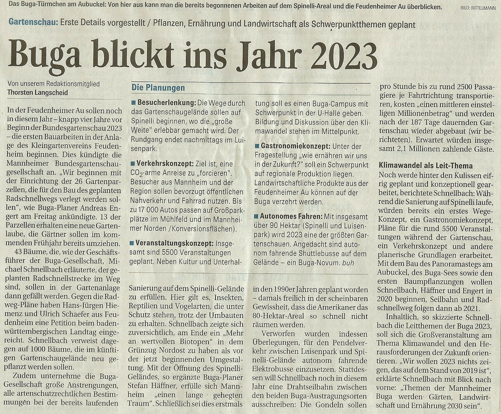 Aus dem beigefügten Bericht des Mannheimer Morgen vom 20.7.2019 geht hervor, dass noch in diesem Jahr die ersten Bauarbeiten in der Anlage des Kleingartenvereins in der Au beginnen sollen!!!