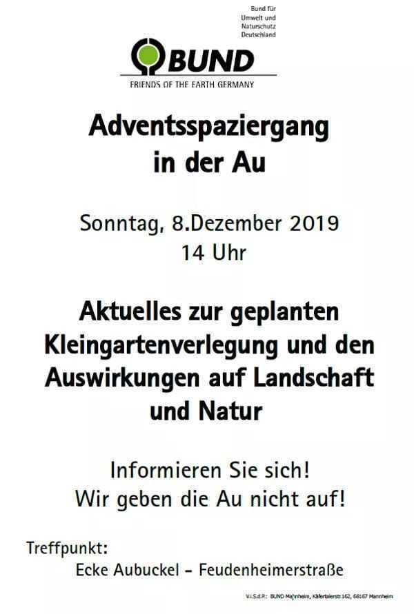 Der BUND möchte angesichts der aktuellen Ereignisse in der Feudenheimer Au im Zusammenhang mit der Verlegung von Kleingärten und dem geplanten Bau eines Radschnellwegs die Öffentlichkeit über Vorgänge, Hintergründe und seine Position informieren. Dazu lädt der BUND am zweiten Advent, also am Sonntag 8.12.2019 um 14 Uhr zu einem Ortstermin in Form eines Spaziergangs durch die betroffenen Teile der Au ein. Über Eure/Ihre Teilnahme an dieser Veranstaltung würden wir uns freuen; Näheres entnehmt/entnehmen Sie bitte dem anhängenden Flyer.