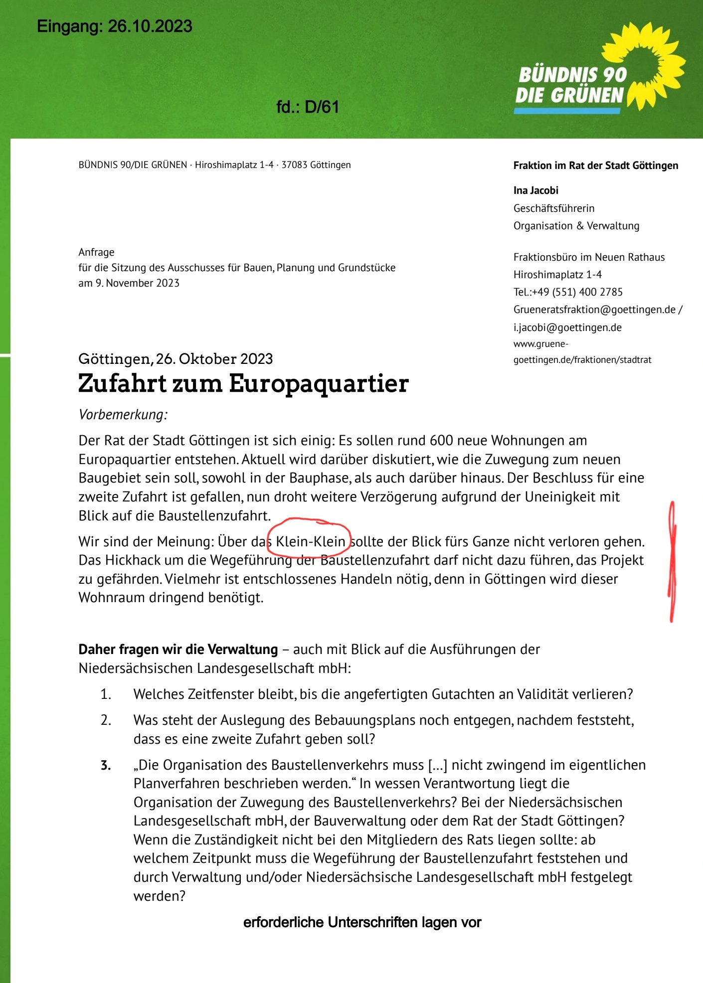 Hat OB Frau Broistedt aus #Göttingen Ministerin für Wohnen und Bauen Frau @klara_geywitz in München auf der Real Expo auch erzählt, dass für das #Europaquartier der benachbarte dörfliche Ortsteil #Holtensen den Durchgangs- und 8jährigen Bauverkehr vorbei an KITA und Spielstraße erdulden soll? Sieht so ein geglücktes Verkehrskonzept aus? 2019 und 2021 kommt die Stadtverwaltung zu dem Ergebnis, das keine zweite Zufahrt benötigt wird. Nun kurz vor dem geplanten Baubeginn auf den letzten Drücker doch? Welche neuen Erkenntnisse hat die Stadt dazugewonnen?
