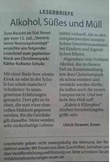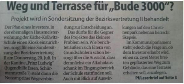 Wenn Sie uns weiterhin helfen möchten, kommen Sie bitte morgen, Donnerstag den 20.07.2017 um 16:30 Uhr zur Sitzung der Bezirksvertretung II, in der Kantine "Prinz Ludwig", Schürmannstr. 7, 45136 Essen. Hier wird möglicherweise vorentscheidend über die Zuwegung zur geplanten "Bude 3000" aus dem Christinenpark abgestimmt. Durch eine große Präsenz können wir möglicherweise noch Mitglieder der Bezirksvertretung in ihrem Abstimmverhalten beeinflussen. Danke!