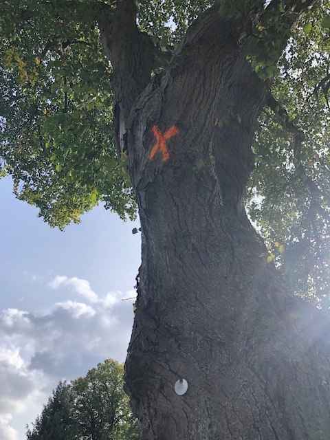 Foto: Markierung für nötige Baumpflegearbeiten/Totholzentfernung, Linde Nr. 422, Lebensraum für Fledermäuse, Nischen- und Höhlenbrüter lt. Gutachten