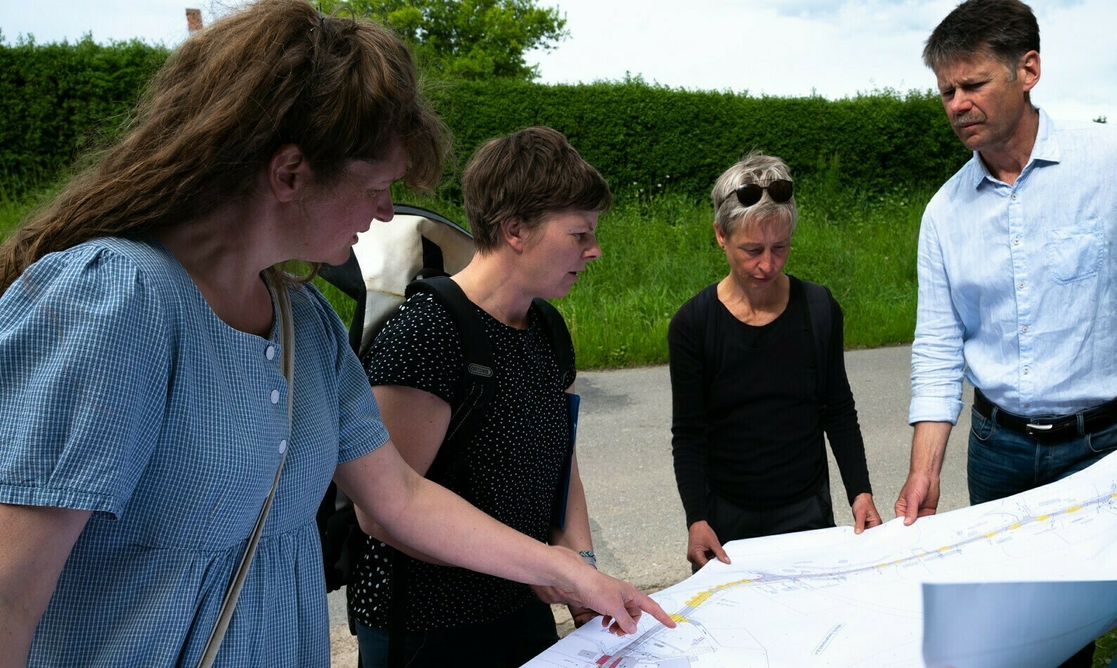 Im Sommer haben wir Stoverlinden mit der Landschaftsplanerin Frau Schmidt einen Nachmittag in Stove verbracht und die Gegebenheiten vor Ort besprochen (Foto). Frau Schmidt hat anschließend für uns Ideen entwickelt, wie die Straßenbauplanung baumschonend erfolgen kann. Ihr Konzept hat Frau Schmidt uns vor einigen Tagen vorgestellt.