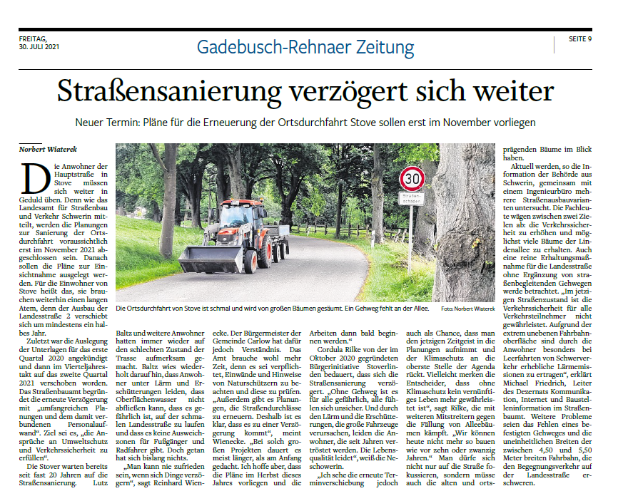 das II. Quartal 2021 ging ohne die angekündigte öffentliche Auslegung des Straßenbauplanes für Stove zu Ende. Das Straßenbauamt Schwerin (SBA) informierte uns vor einigen Tagen telefonisch über die erneute Verschiebung des Termins. Aufgrund von zusätzlichen Planungs-Aufgaben bei laufenden Bauprojekten des SBA kann die Straßenbauplanung Stove derzeit nicht weiter bearbeitet werden.