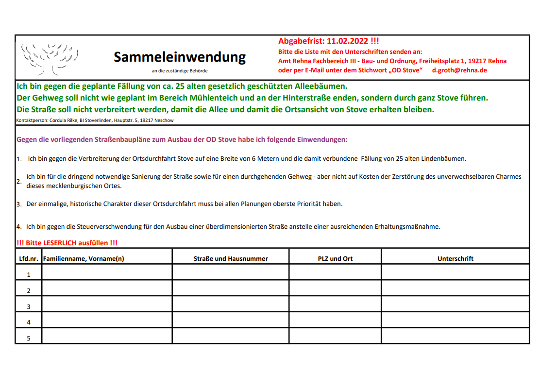 Wer jetzt noch einmal aktiven - unbedingt nötigen - Einsatz zeigen möchte für die Rettung unserer alten Alleebäume und die schöne, unwiederbringliche, historisch wertvolle Dorfansicht von Stove, der druckt sich unsere Sammeleinwendung aus (ggf. mehrmals) und unterschreibt diese mit so vielen Menschen wie möglich!