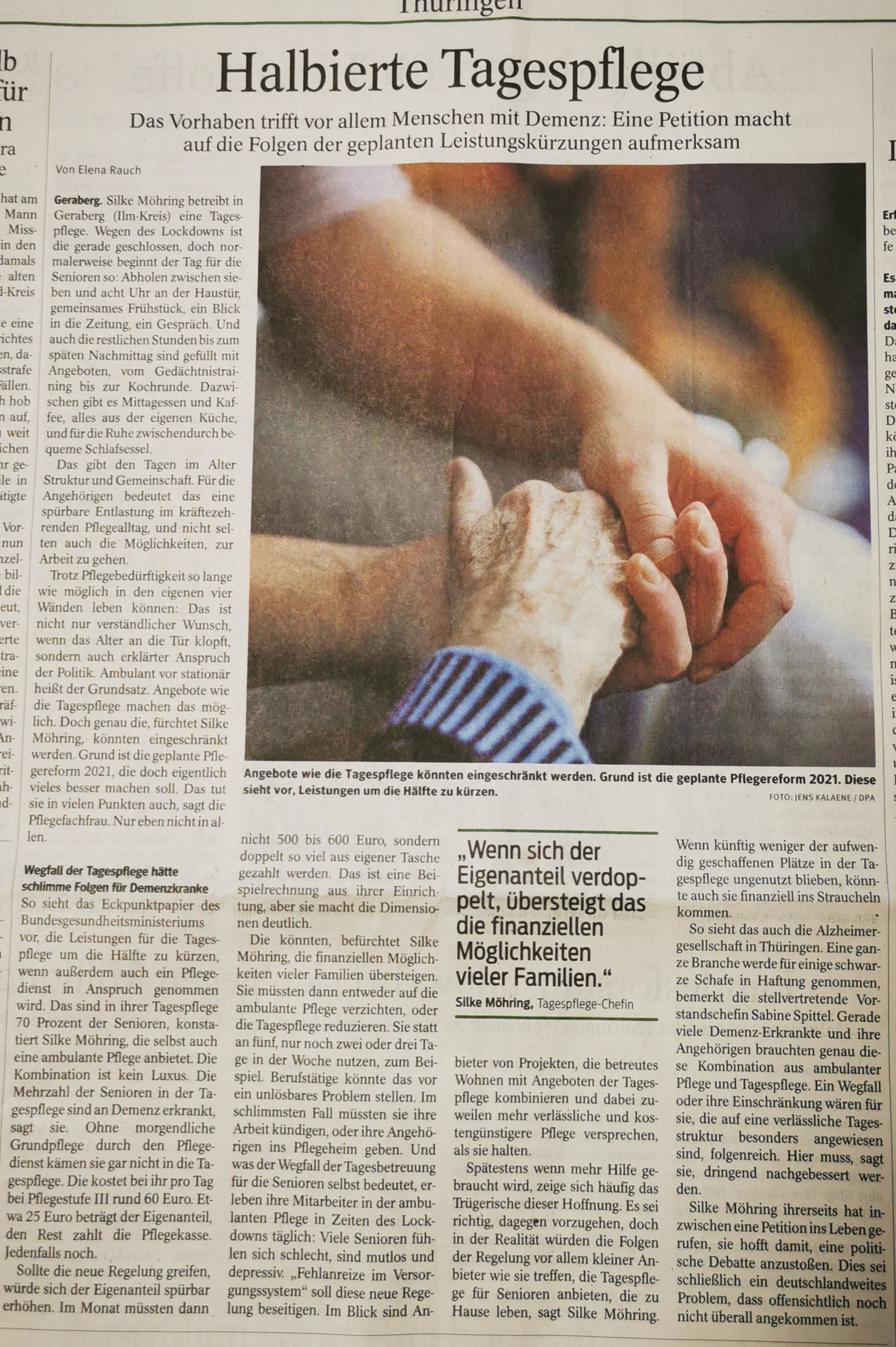 Als Anlage das Eckpunktepapier für die geplante Pflegereform 2021 mit sicherlich vielen Guten Vorschlägen aber eben auch der geplanten Sachleistungskürzung bei den Tagespflegen wenn ebenfalls ambulante Pflegedienste in Anspruch genommen werden.