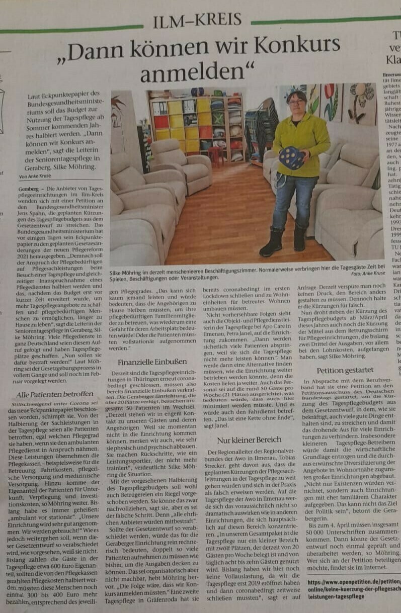 Ich habe diese Petition stellvertretend für alle Pflegebedürftigen und die Tagespflegen in Deutschland erstellt. Aber nur mit der Unterstützung ALLER ist es möglich hier noch den Gesetzentwurf zur Überarbeitung und somit zur Streichung des Vorhabens zu bringen.