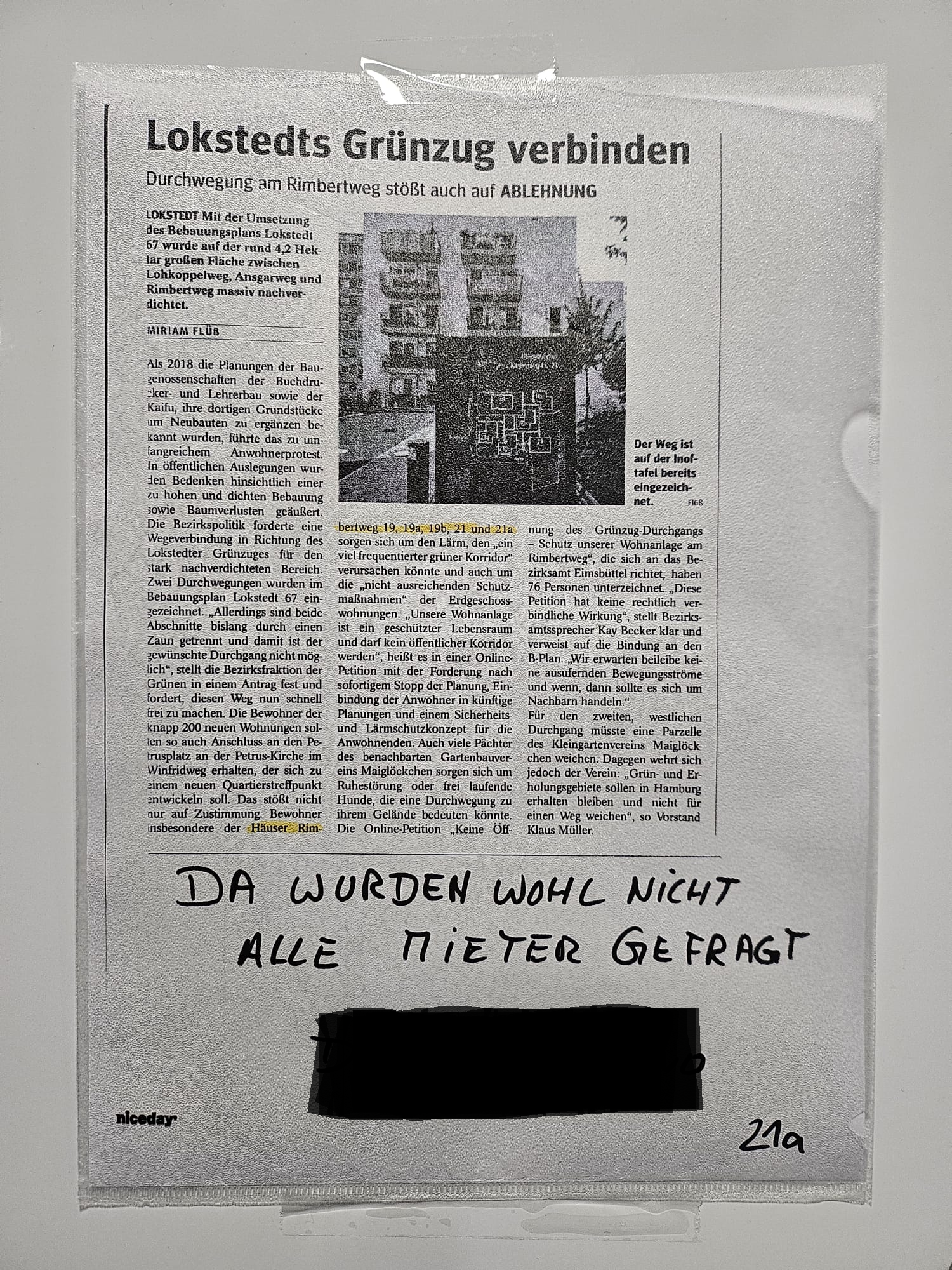 Ein direkter Nachbar hat den Artikel mit einem handschriftlichen Hinweis versehen, der die ablehnende Stimmungslage unterstreicht. (Bild im Anhang, Name zum Schutz der Privatsphäre geschwärzt)