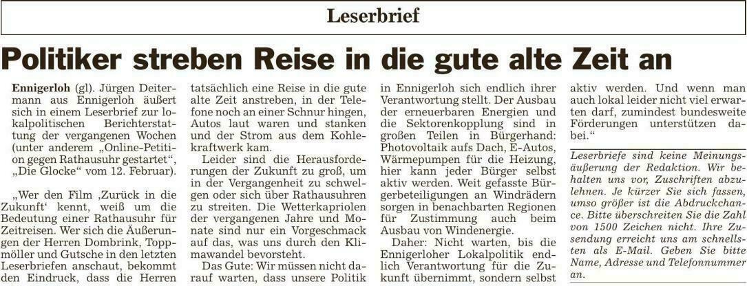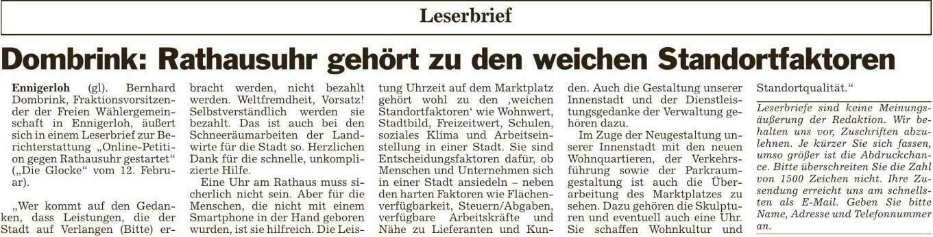 ich möchte Ihnen den heutigen Leserbrief von Bernhard Dombrink (FWG Fraktionsvorsitzender im Rat der Stadt Ennigerloh) nicht vorenthalten.