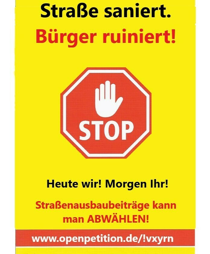 Die Hoffnung liegt aber auch darauf, das die STRABS auf Landesebene abgeschafft wird. Auch hier läuft eine Petition und auch hier wird (falls nicht geschehen) Ihre Unterschrift benötigt.