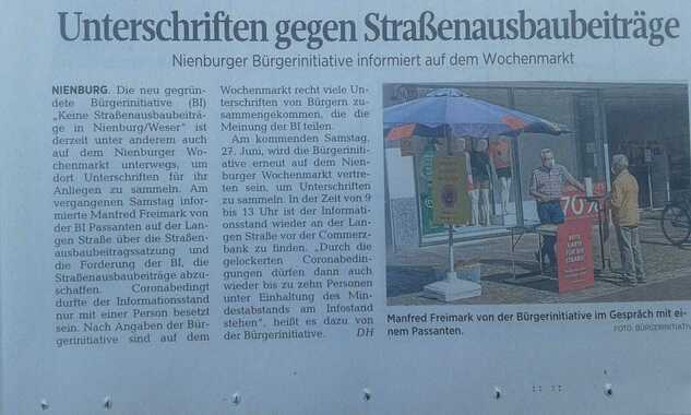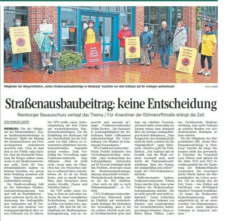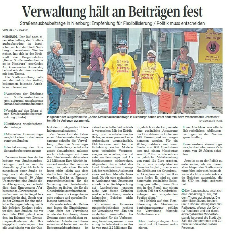 bitte lesen Sie einen Zeitungsartikel "Verwaltung hält an Beiträgen fest - Straßenausbaubeiträge in Nienburg: Empfehlung für Flexibilisierung / Politik muss entscheiden"