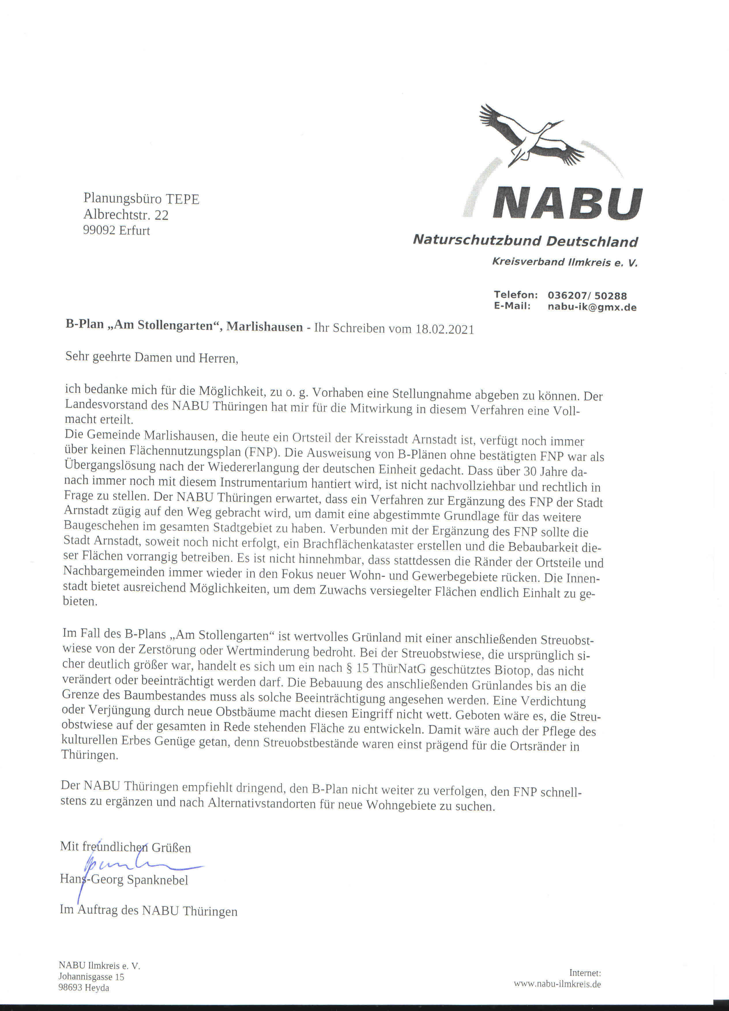 Der Arnstädter Bürgermeister Herr Spilling hat bisher immer betont, dass weitere Wohngebiete in Marlishausen, und damit auch das „Am Stollengarten“, nicht gegen den Willen der Einwohner und des Ortschaftsrates weiterentwickelt werden.
